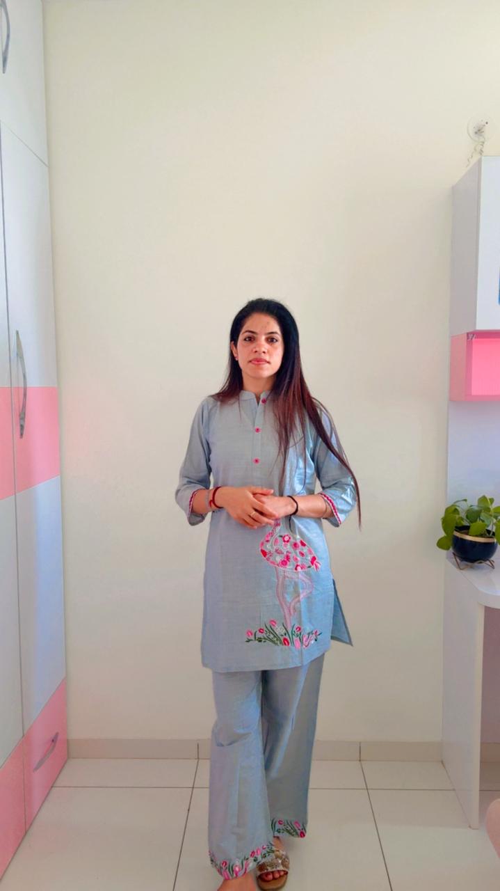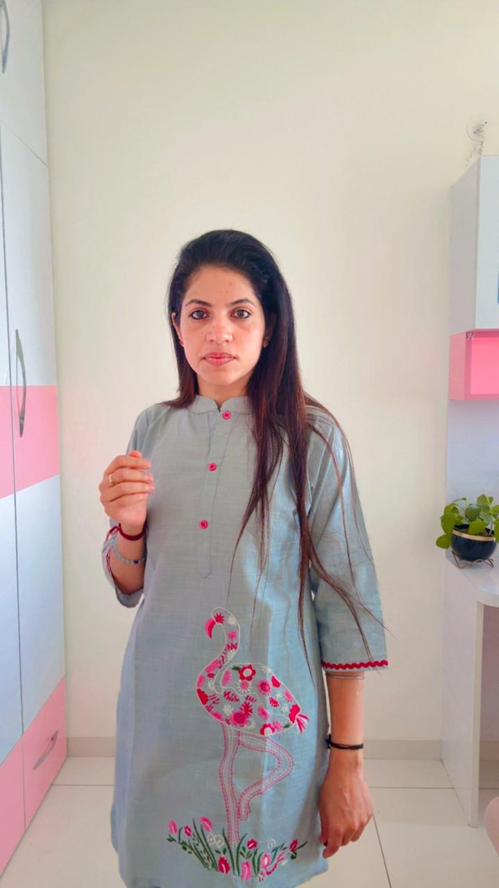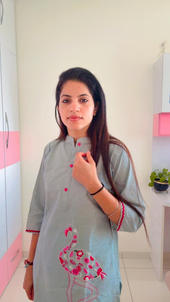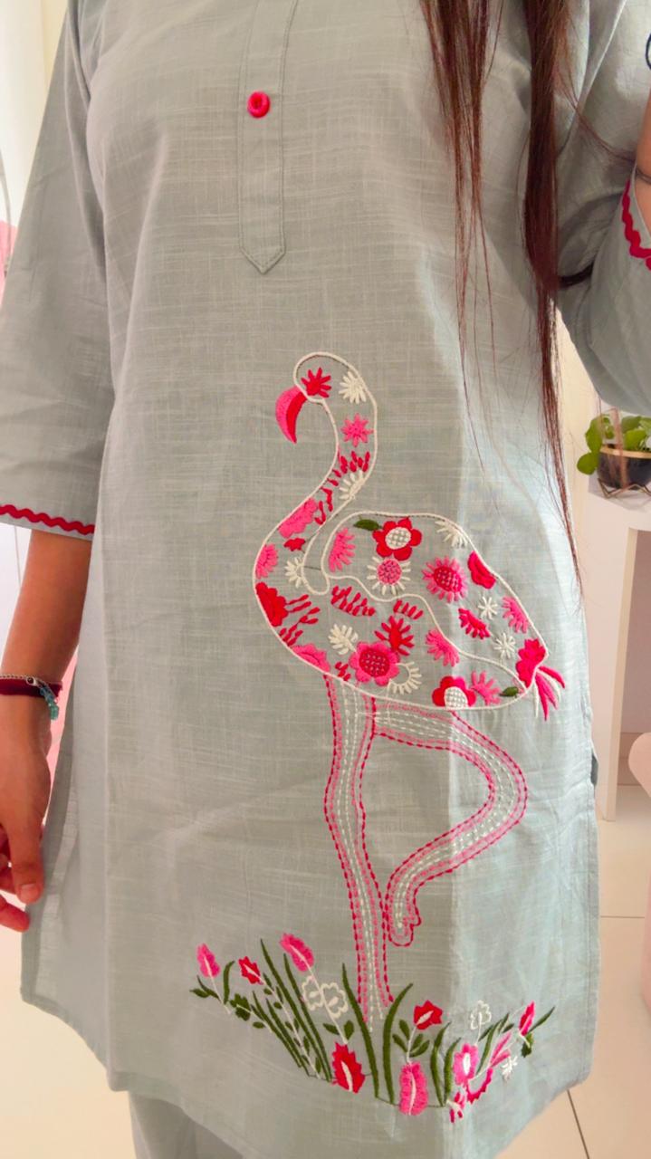 A straight-cut light grey kurta with a Mandarin collar, three-quarter sleeves, and a prominent pink flamingo thread-work motif on the front, complemented by floral embroidery at the hem and trouser borders.