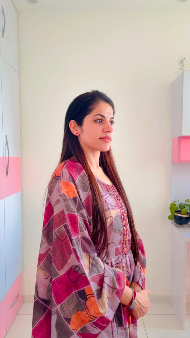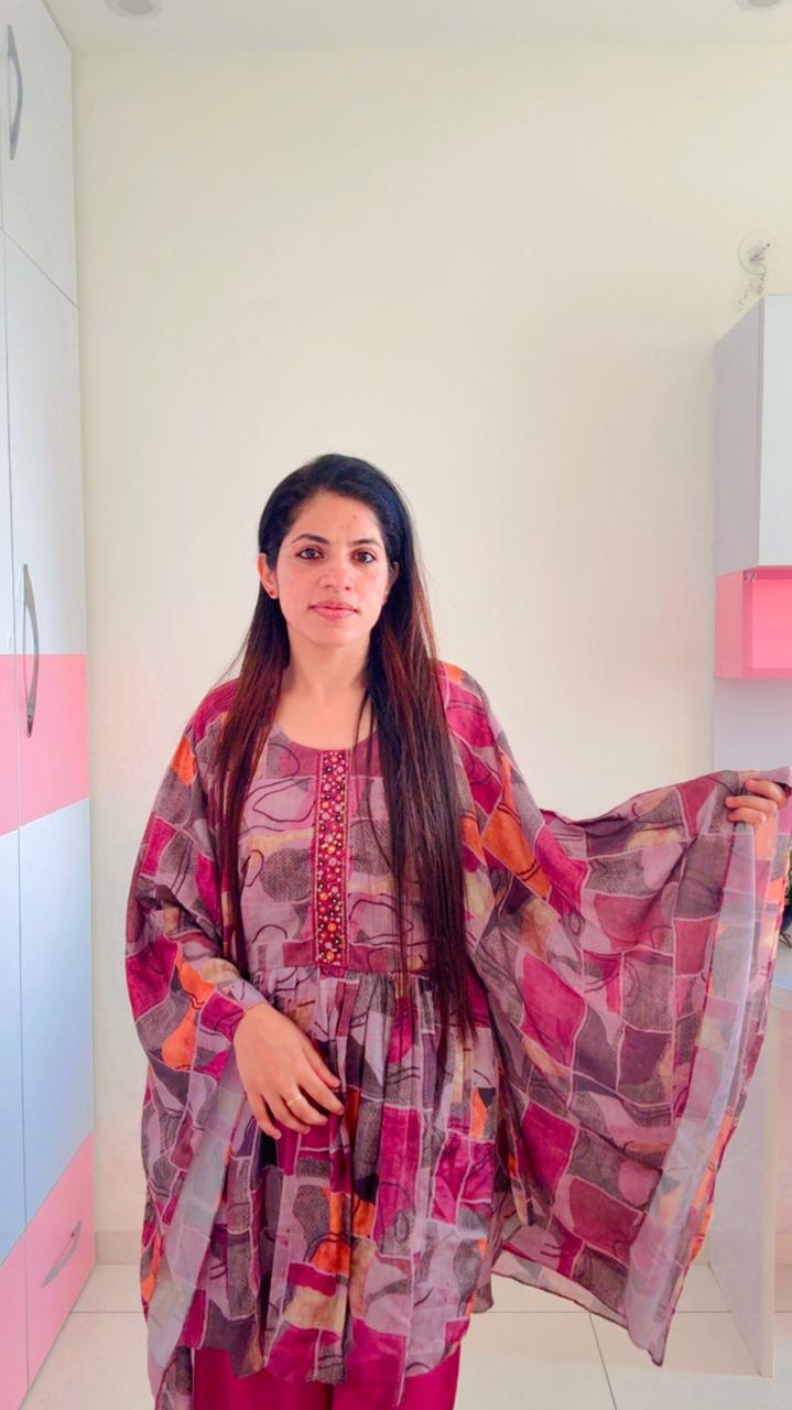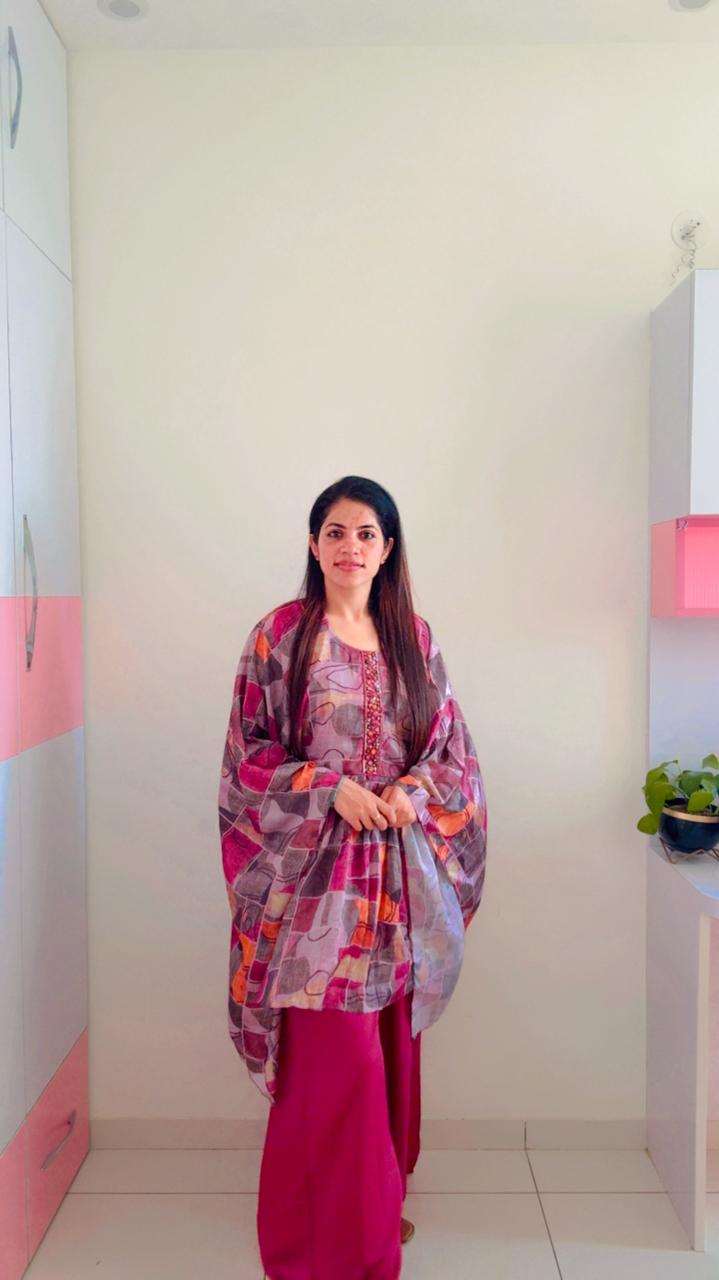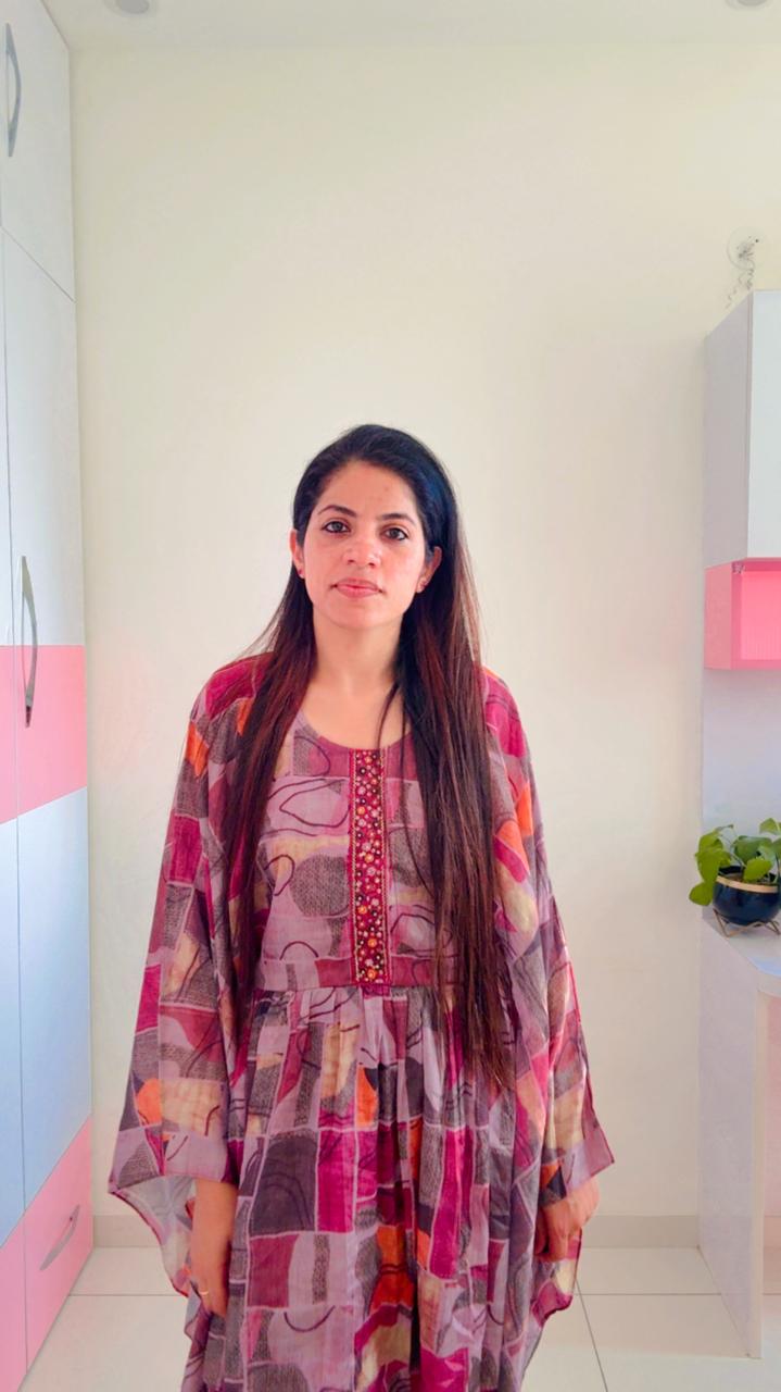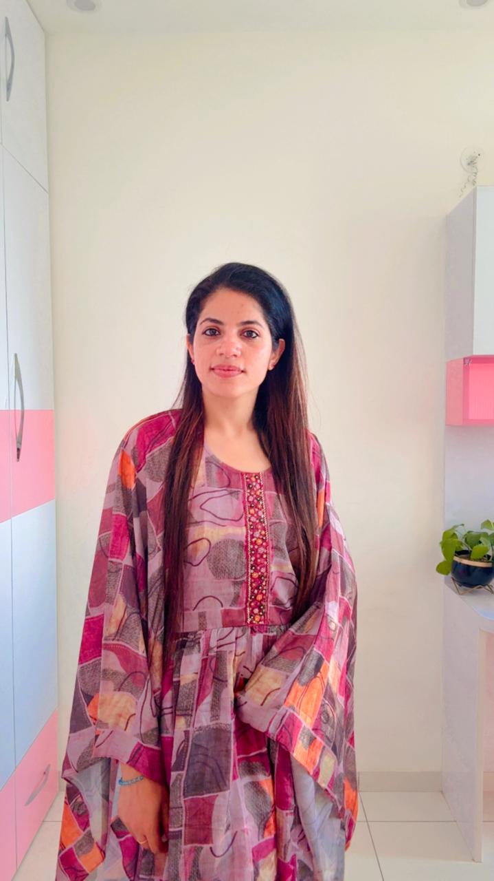 Flared, batwing-style sleeves typical of a kaftan, offering a relaxed and breezy fit. Solid magenta, straight-fit Palazzo that complement the primary color of the print.