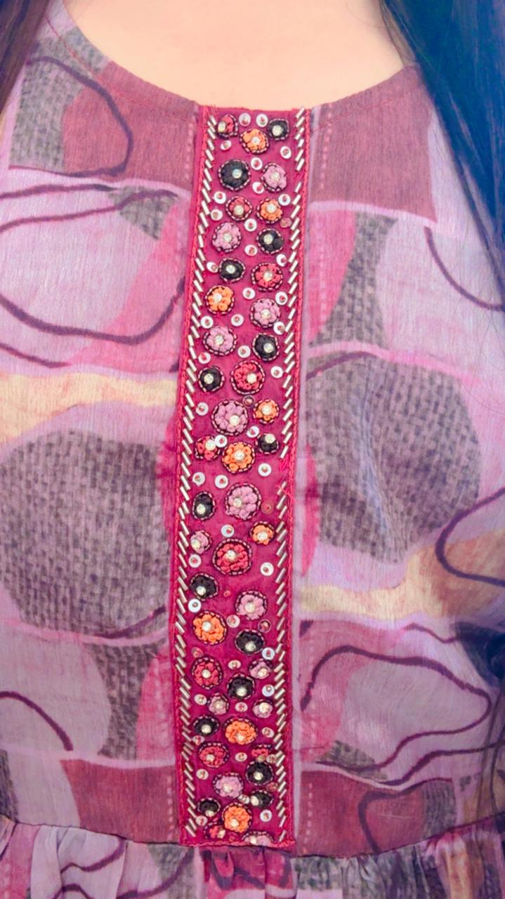 A mid-length kaftan with an abstract, geometric print in shades of magenta, purple, and hints of orange. It features a hand-embroidered placket embellished with sequins, beads, and small floral motifs in orange and dark purple.