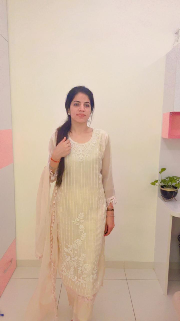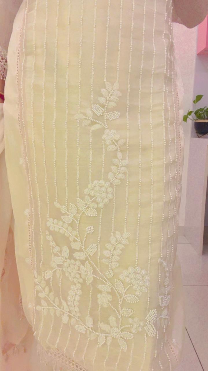 Off white straight kurta with beads work and lace at the bottom.