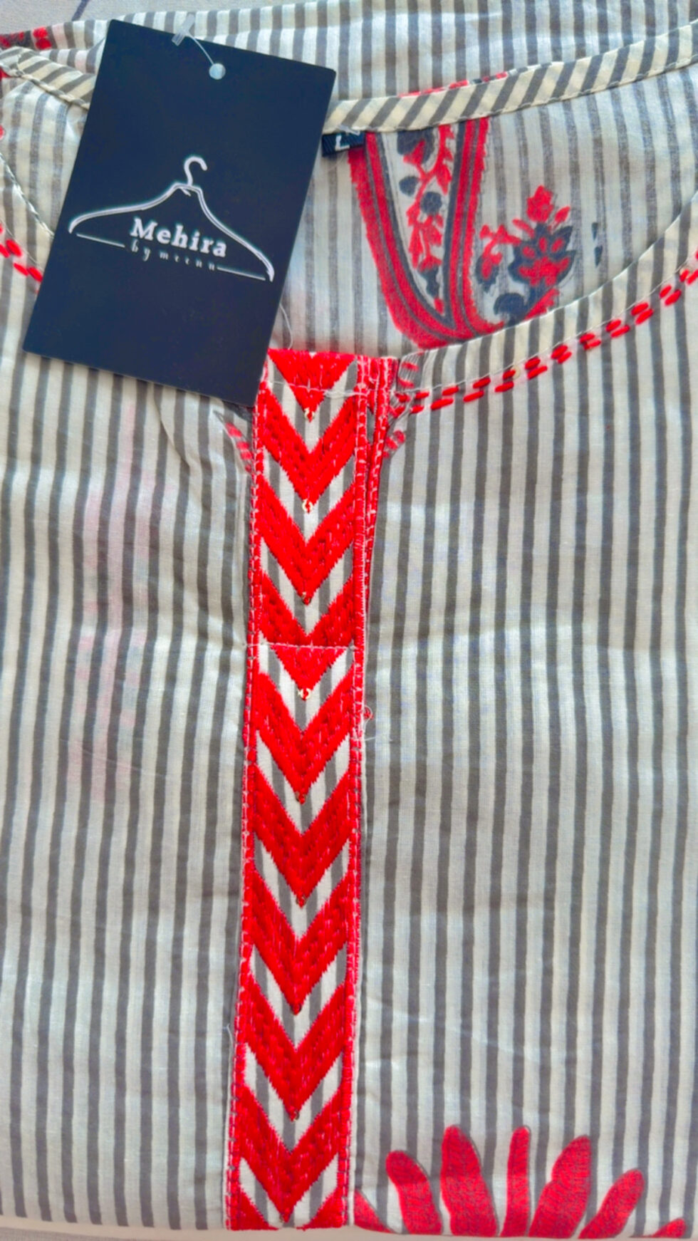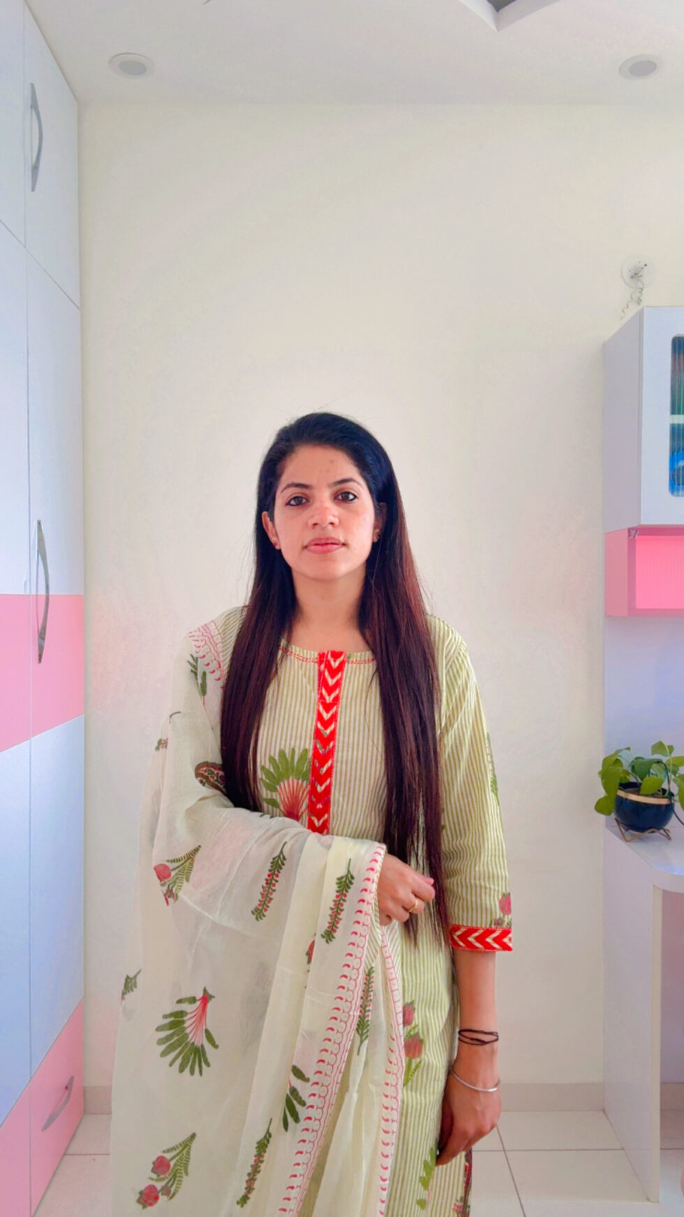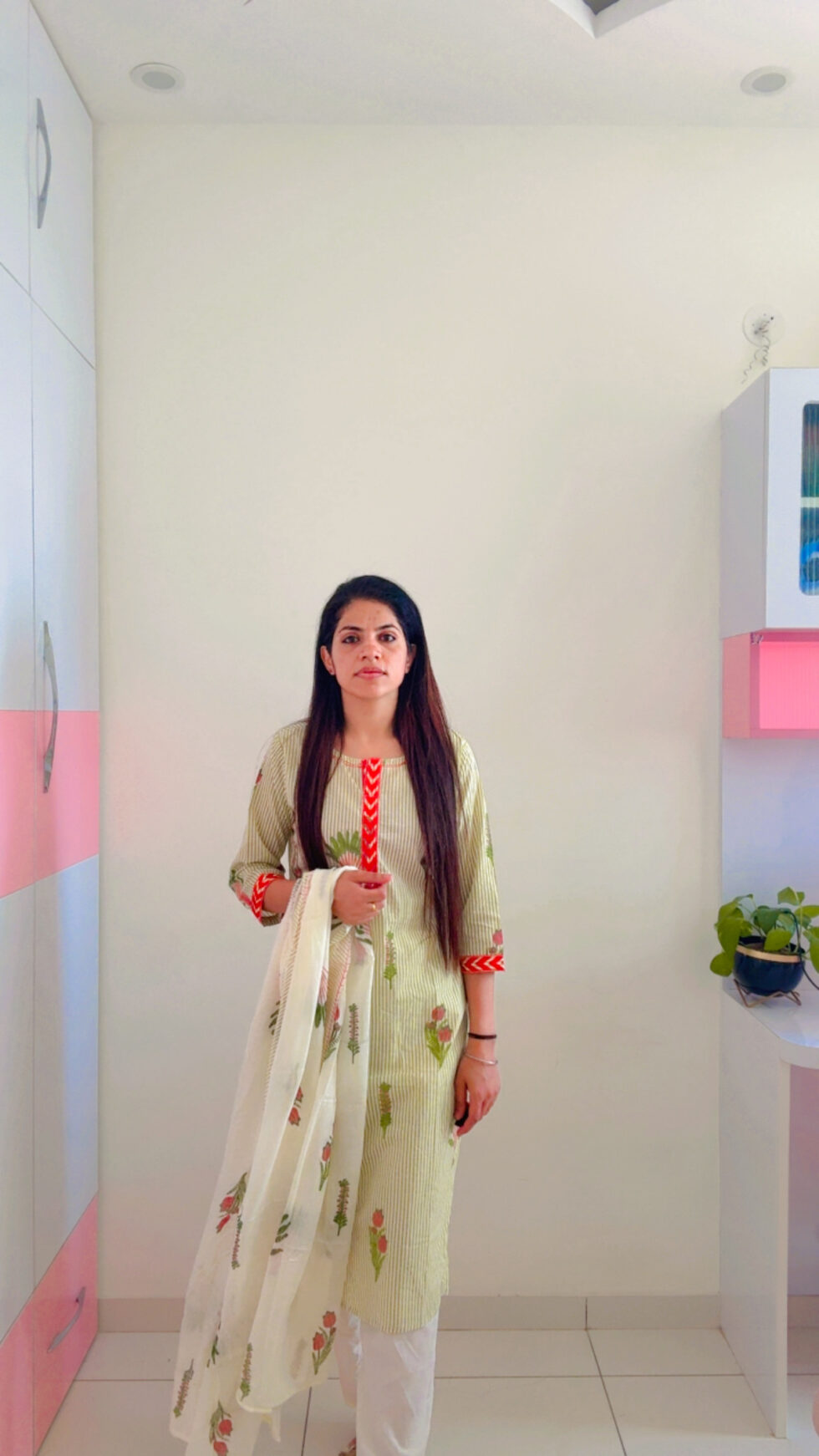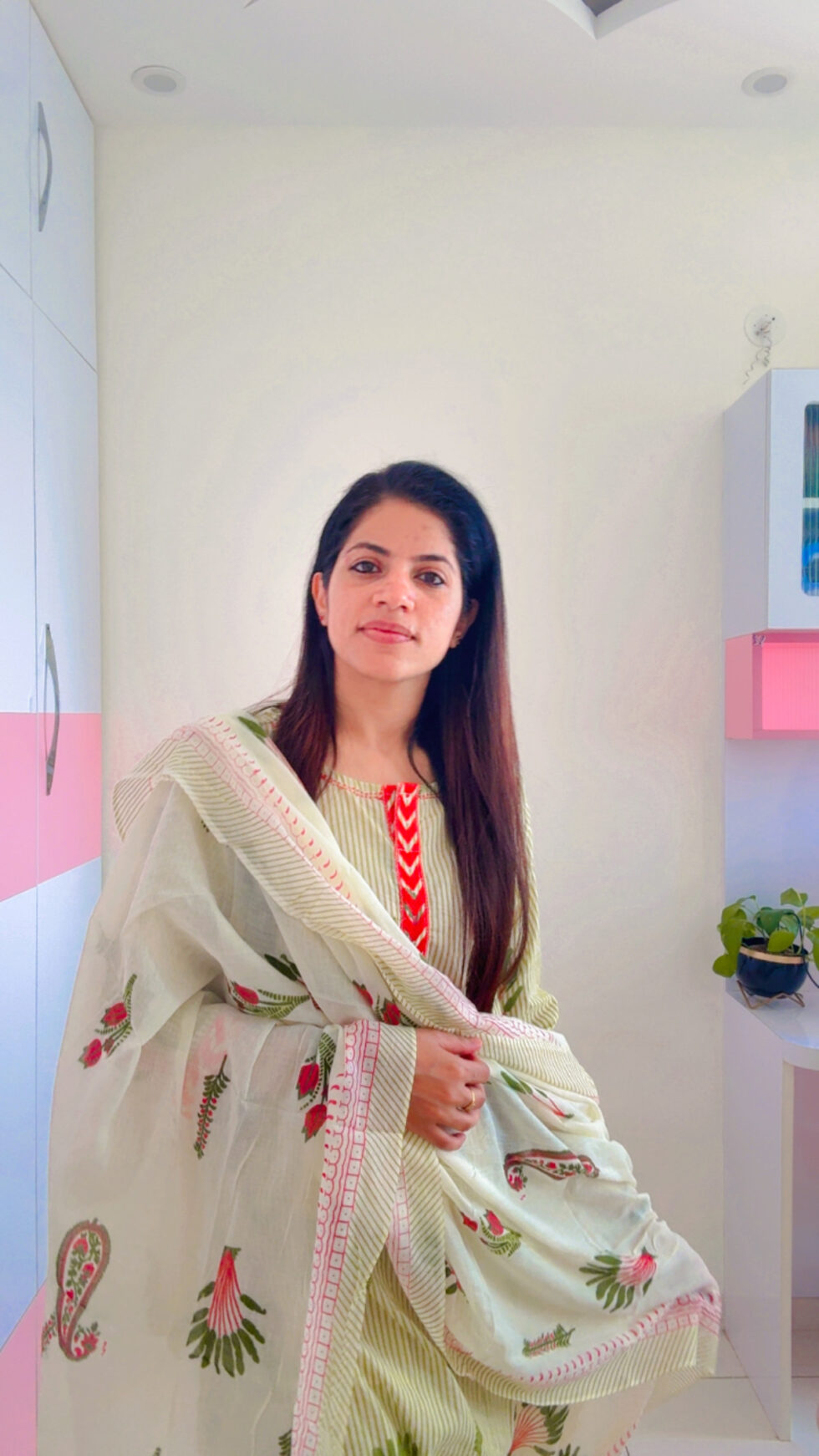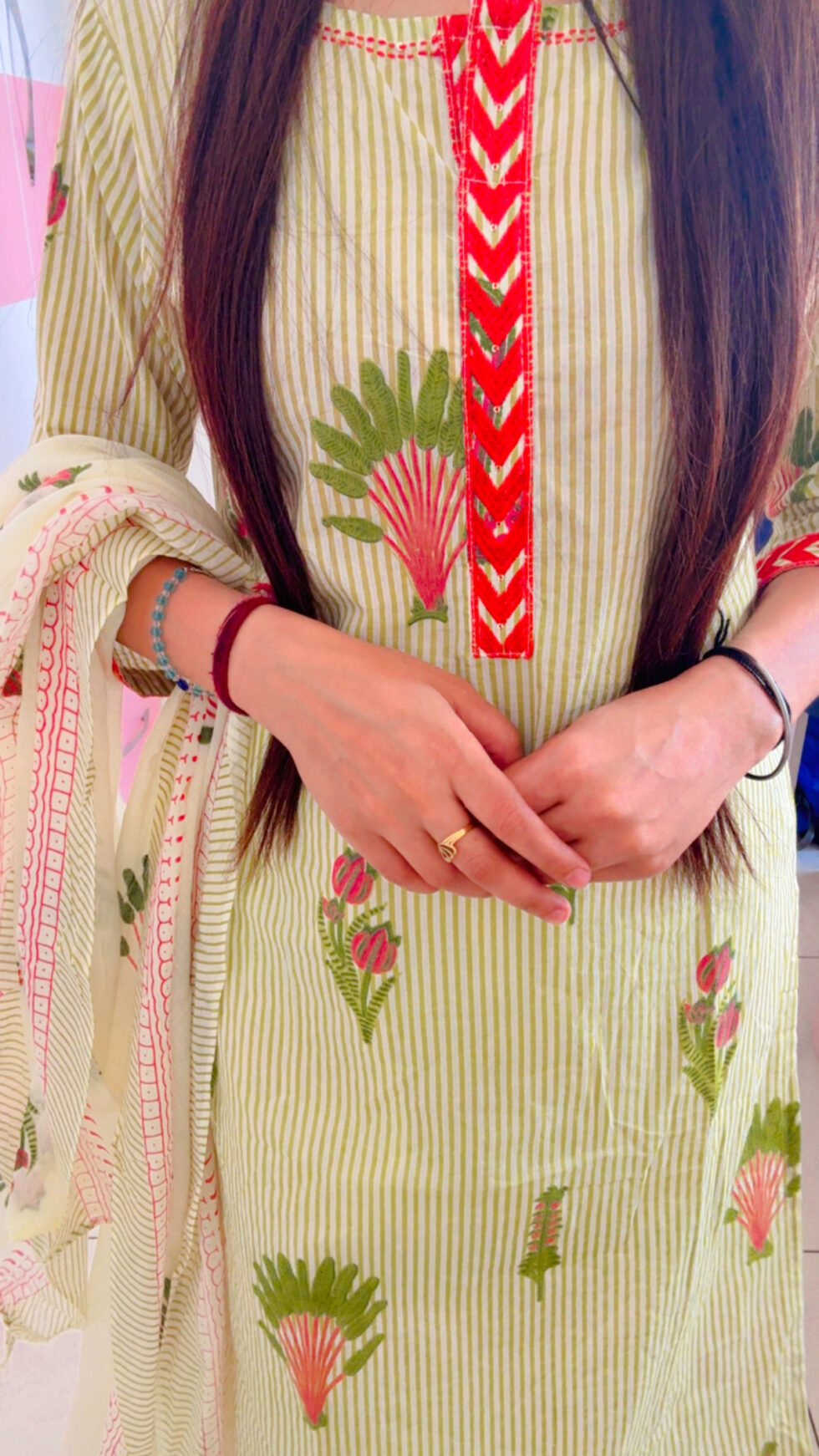 Elevate your daily ethnic wardrobe with this chic and breezy 3-piece suit set. Combining traditional motifs with a modern geometric print, this ensemble is designed for the woman who values both comfort and a sophisticated aesthetic. Premium breathable cotton, perfect for all-day wear and warm climates. A soothing base of Sage Green and White vertical stripes, accented by vibrant Scarlet Red embroidery and floral prints.The contrast between the structured stripes and the soft floral embroidery makes this outfit incredibly versatile. It transitions perfectly from a productive day at the office to a casual evening tea with friends.