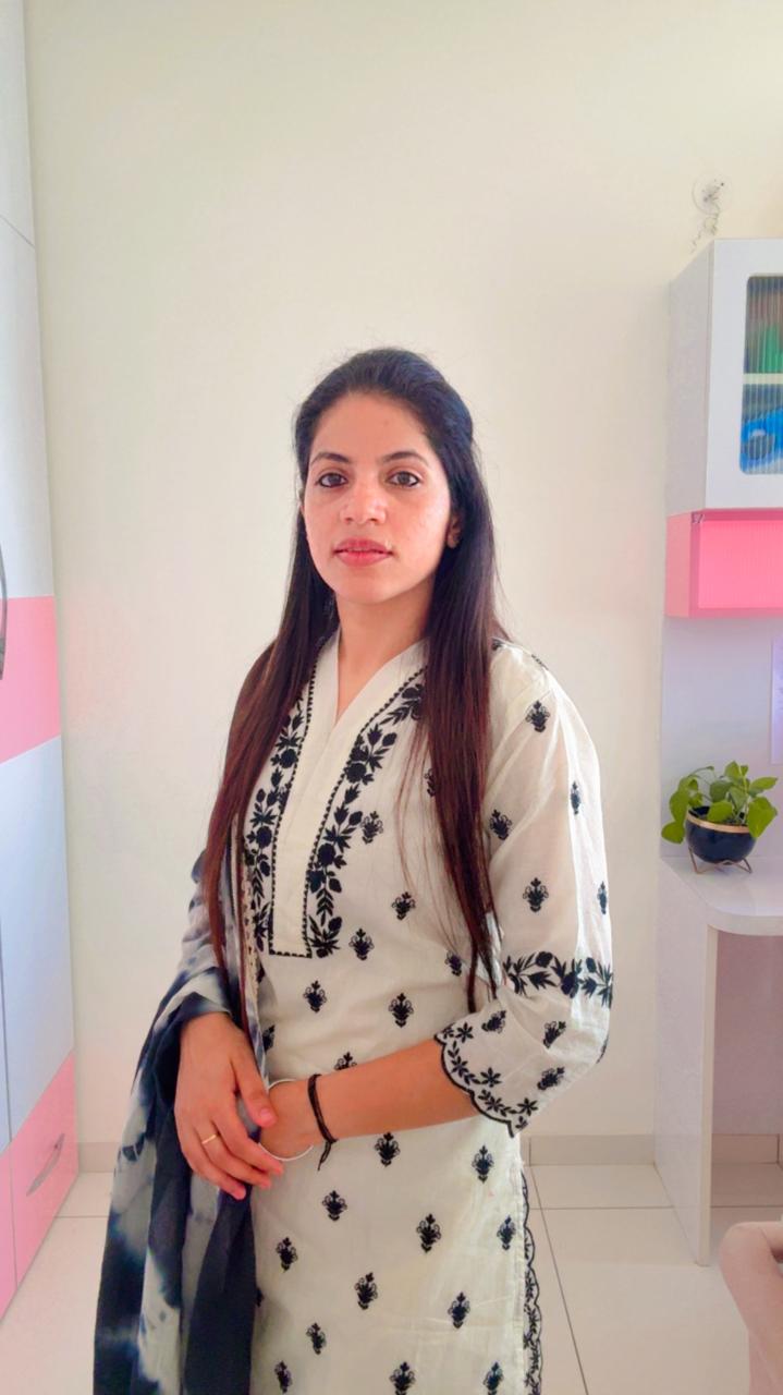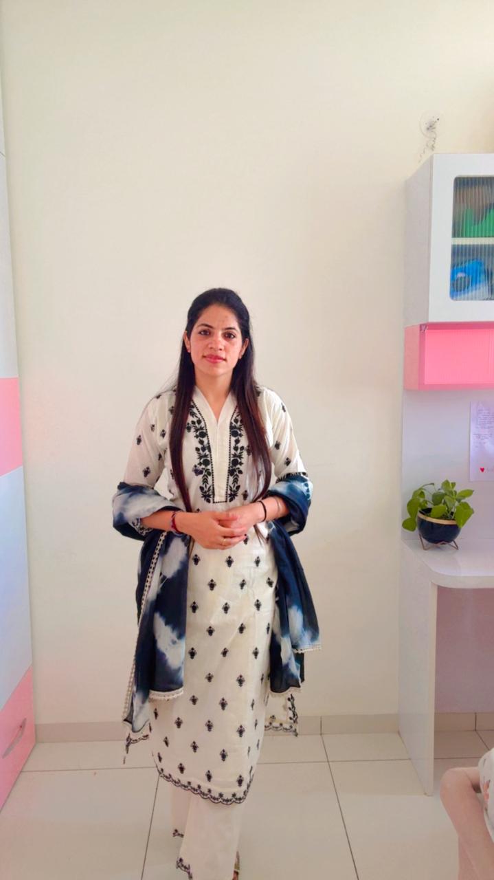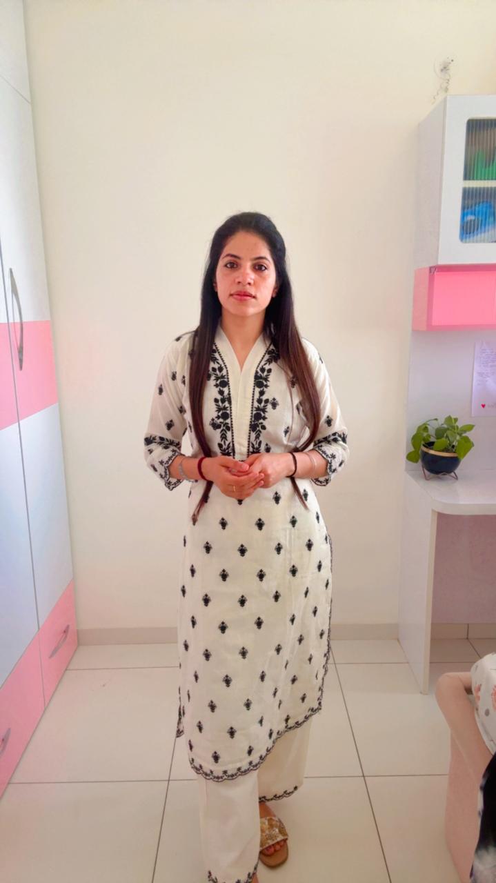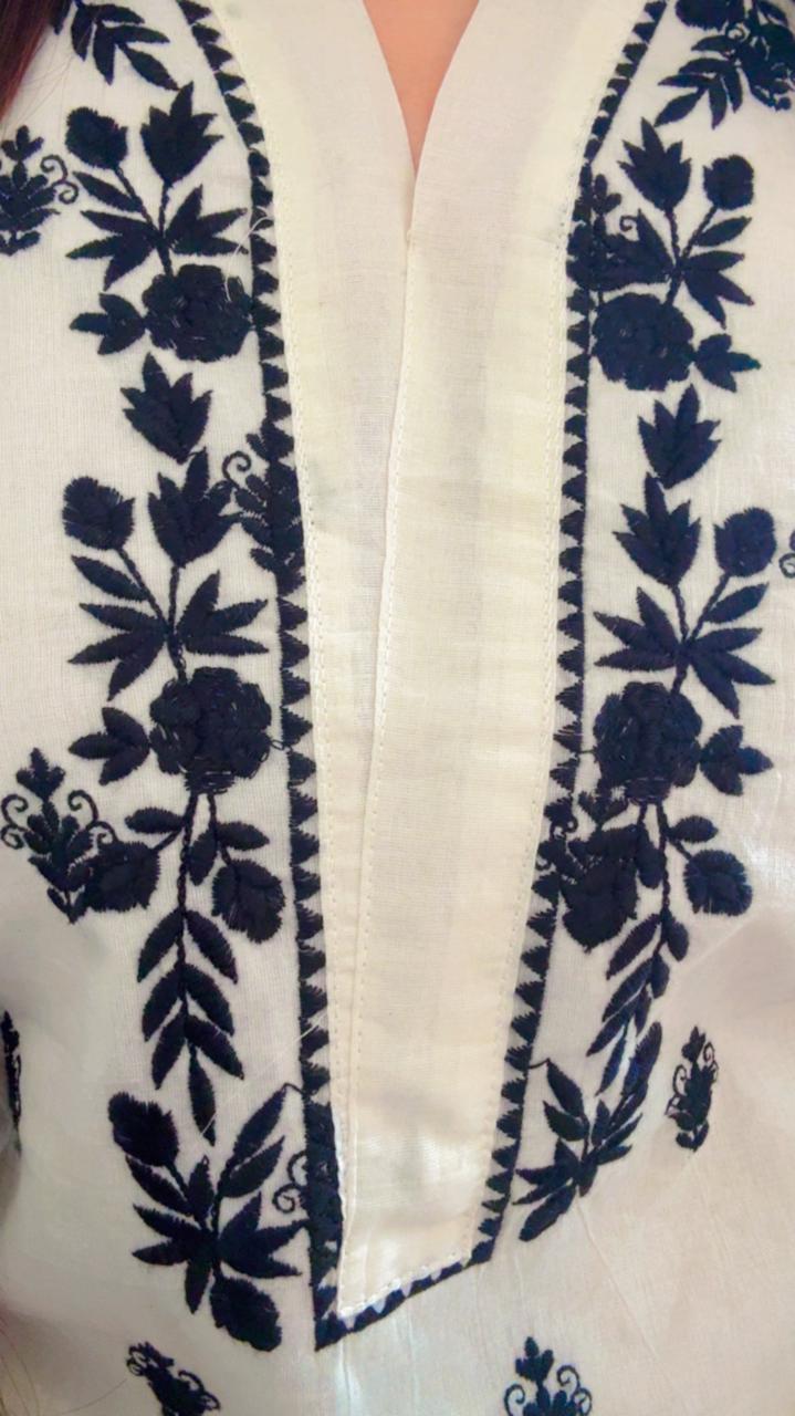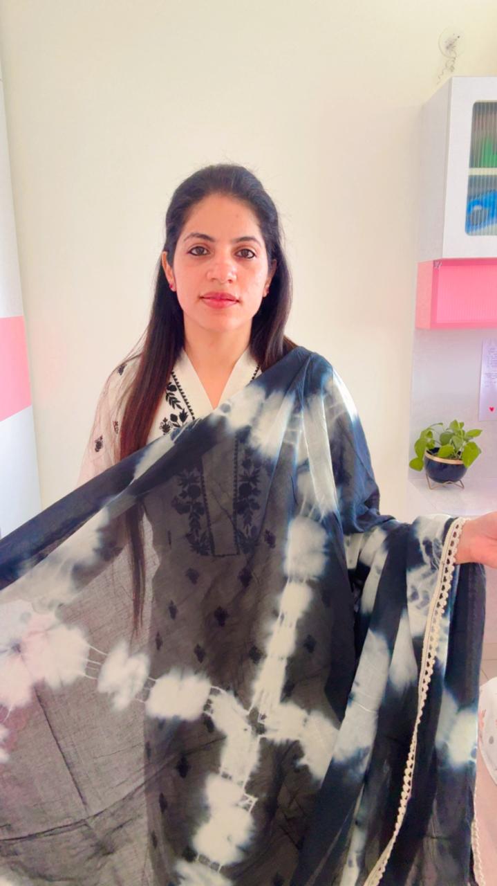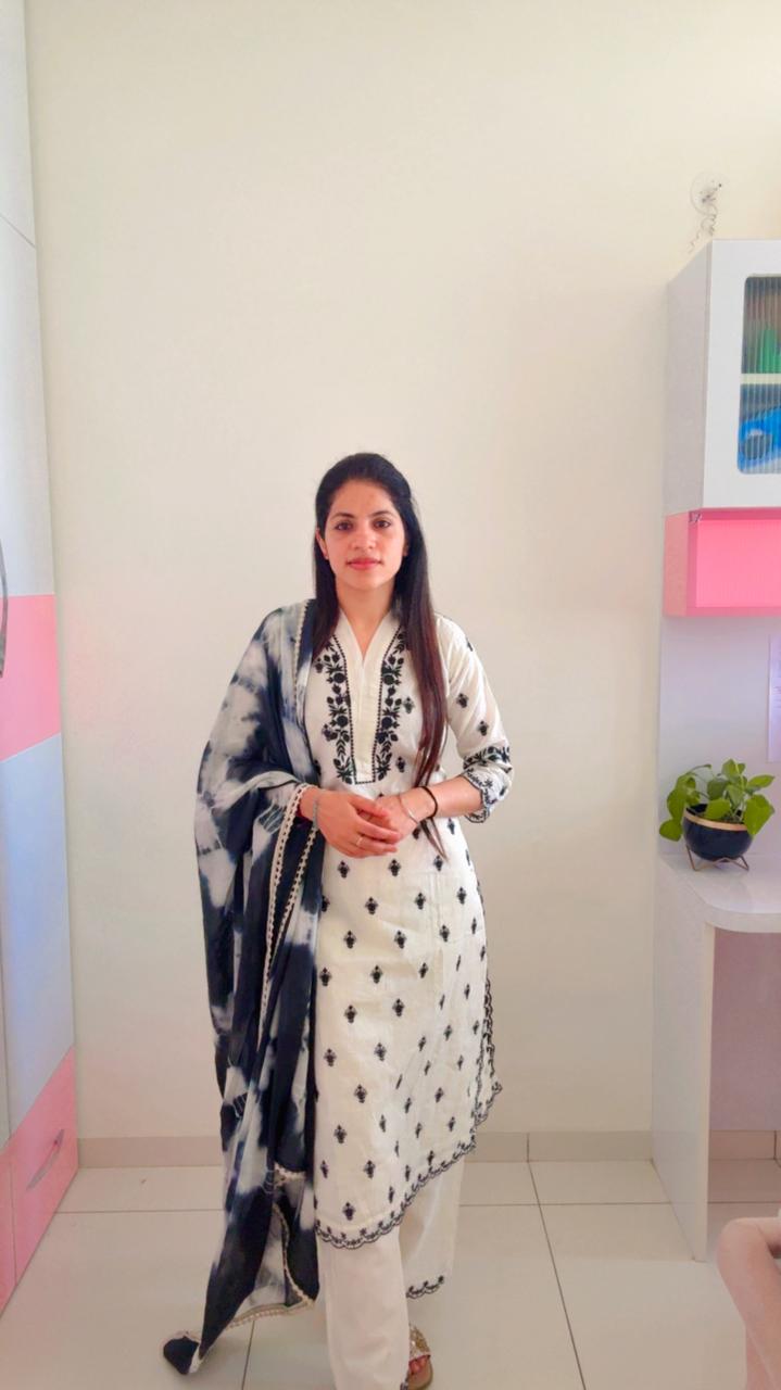 Elevate your ethnic wardrobe with this stunning 3-piece white cotton kurta set. Featuring intricate black floral embroidery, a split V-neckline, and a striking black-and-white shibori tie-dye dupatta, this ensemble perfectly blends traditional craftsmanship with modern minimalist style. Ideal for office wear, festive gatherings, or elegant daytime events.