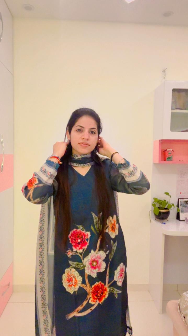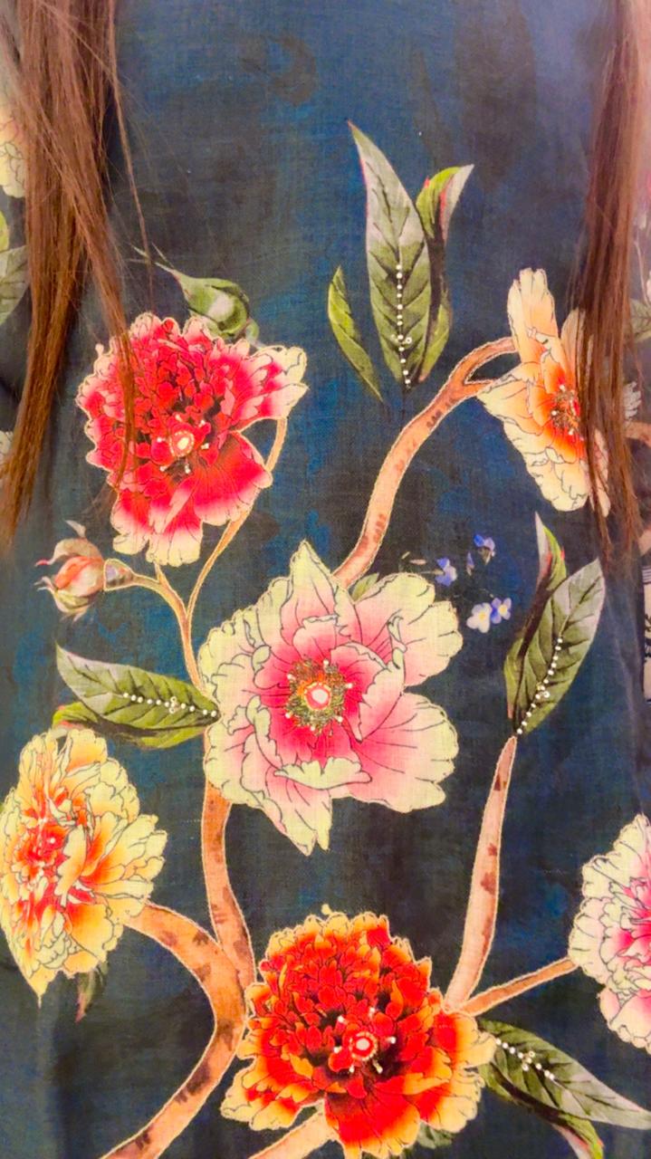 The rich palette of coral, cream and deep pink blossoms creates a sophisticated contrast against the dark fabric. It is graceful, traditional and polished perfect for festive occasions or elevated everyday wear.