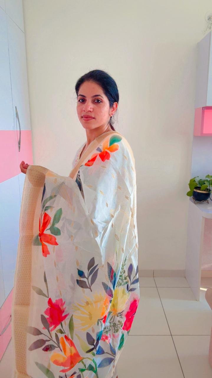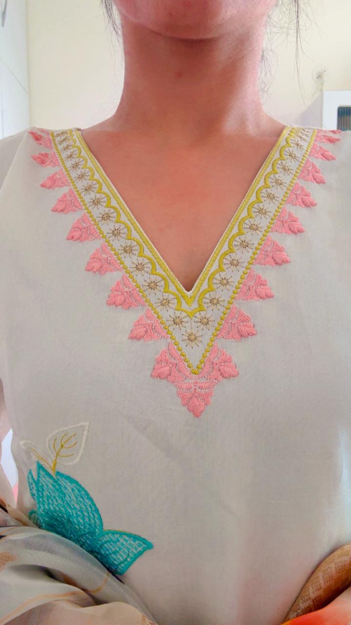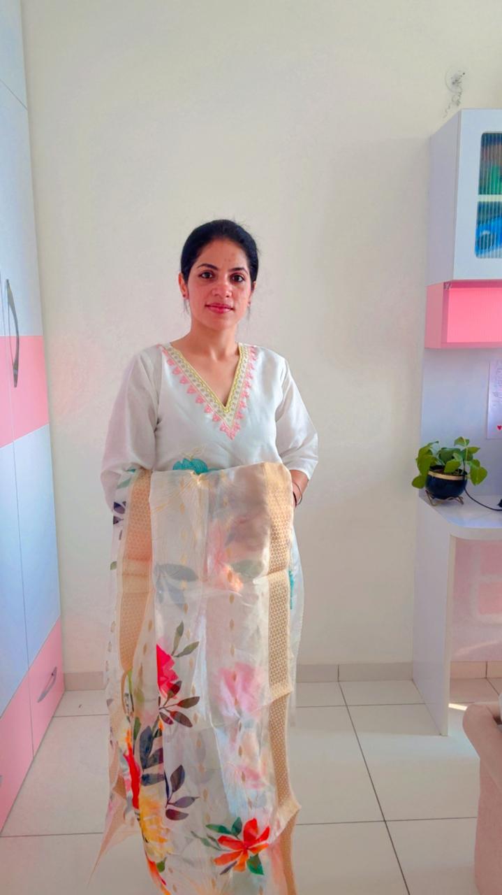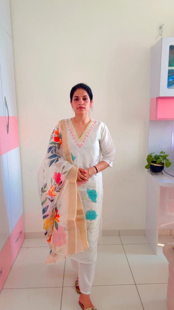 Elevate your ethnic wardrobe with this Pristine White Embroidered Kurta Set, paired with a striking Floral Organza Dupatta. Designed for the modern woman who appreciates subtle luxury, this outfit combines clean lines with intricate, colorful floral thread embroidery.